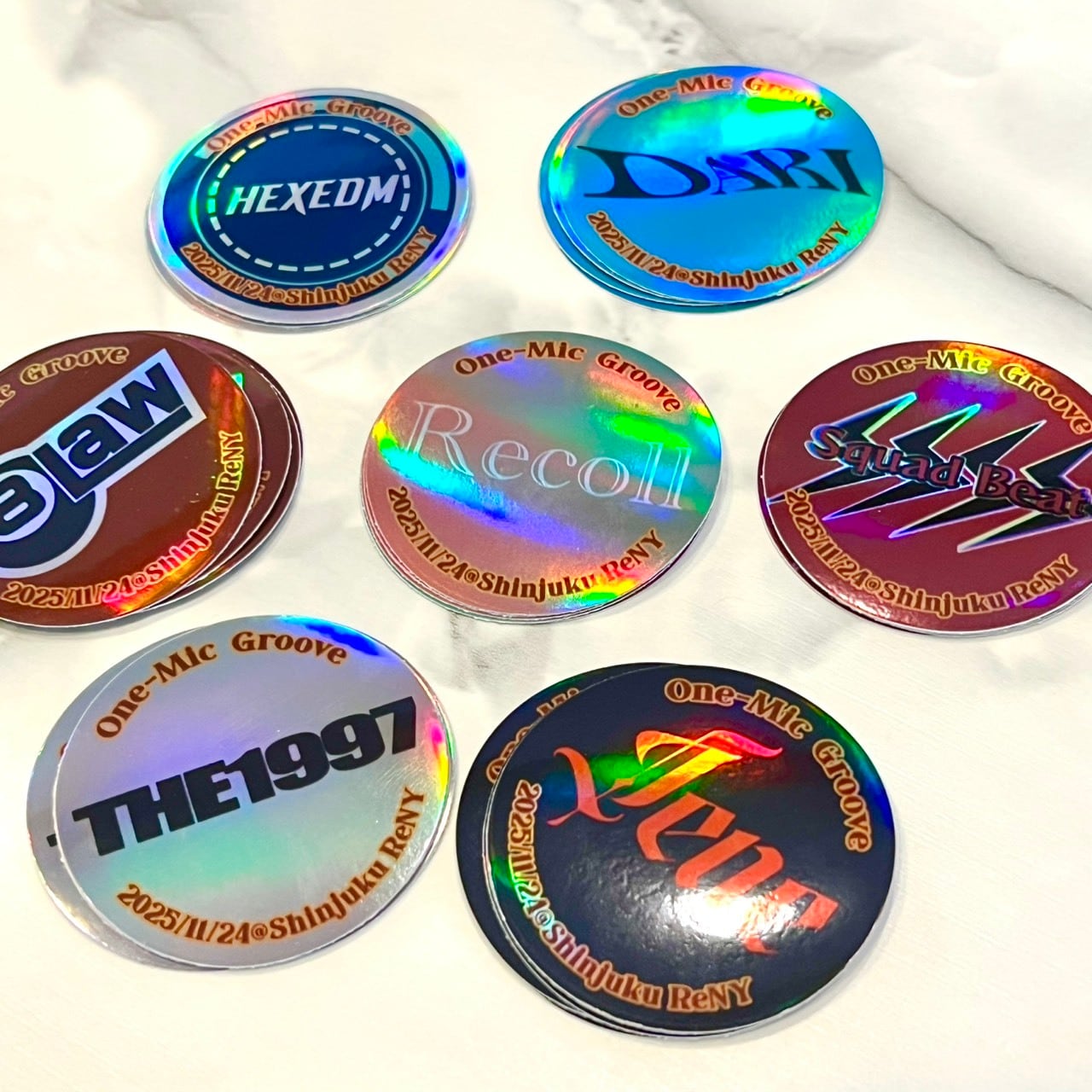 2025年「ワンマイクグルーヴ」に出演したアーティストのロゴをデザインしたステッカー、全7種類セットです。キラキラのホログラム加工で、とっても華やかに仕上がっています!